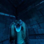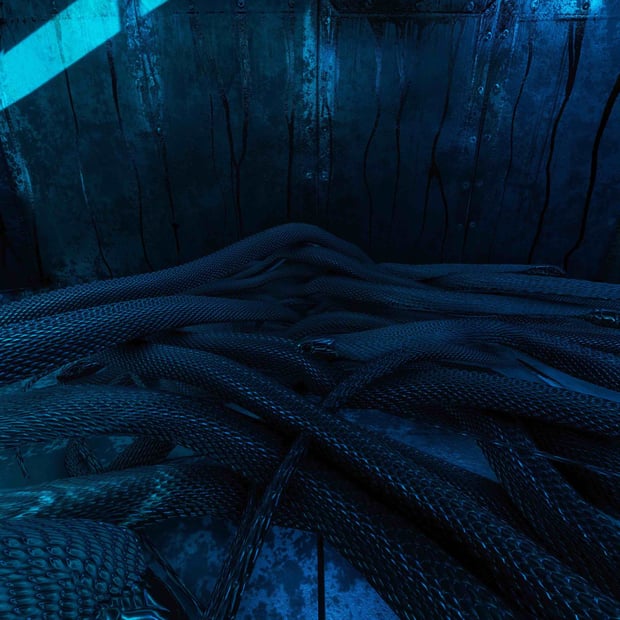 Christian Lemmerz’s VR work TRAUM (2018) materialises the tragic as a virtual space, using the aesthetics of hyper realistic video games to create a Freudian nightmare. Users find themselves in a steel cell, that flits from total smoke-filled darkness to dim illumination. Snakes slowly slither into the space, multiplying in number as they turn on the viewer. Fear, helplessness and vulnerability materialise as a paralysing force that echoes the oppressive, prison-like surroundings. The medium offers agency only to strip it away, creating feelings of entrapment and mounting claustrophobia.