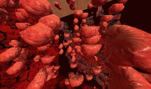 Meatspace is about the confrontation of the body. A reminder that in our increasingly mediated reality our bodies are still trapped within Darwinian husks of meat. One of the dominant narratives of VR is the idea of leaving our bodies behind in a wonderous unbounded new space of infinite possibilities. Running counter to this is the very real experience that VR at times can induce feelings of motion sickness and nausea, where our bodies are not absent but very much present. On one hand VR is all about the non body but at the same time it dramatically amplifies the notion of embodiment, of being in a body. Meatspace explores this space and the reminder of our meat bodies, as the user moves through a series of meat rooms, there is no narrative, no game, no logic, no end, no beginning, just meat. The body of the VR user/viewer is central to the interaction of all behaviours/movement in the work, as extensive head tracking is used and the physical body and its sensorimotor behaviour a key aspect of the entire VR aesthetic experience of Meatspace, in this sense the driver for the work is the human body both conceptually, aesthetically and technically.