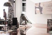 Items Showrooms is primarily a display of semi-functional sculptures used for viewing virtual reality environments. The VR environment's name borrows from the vocabulary of video games, where the word 'item' describes objects of value, tools or even characters with artificial intelligence. In video games, collections of items are assembled in various manners: from menus to showrooms reminiscent of furniture stores. In the virtual space, figures merge into machines, furniture, and body extensions in order to enter their own virtual spaces. The distinction between human and object is blurred by both the figures' lack of interaction with their external environment, as well as the ubiquitous unifying monochromatic textures pulled from Castaneda's paintings, photos and drawings. Personal photos from a trip to the Amazon sit next to appropriated images from diverse sources on the internet and screen grabs of instances in the creation of artworks, various origins and histories blend together as they become abstract textures and patterns. The resulting aesthetic reads modernist alien sci-fi mixed with a gray-scale psychedelia. It is a space somewhere between the past, present and speculative future that merges interior design with video game arcades, while also inevitably highlighting the design of the exhibition itself, as it is usually displayed with physical prototypes of the sculptural machines.