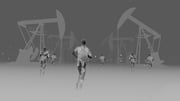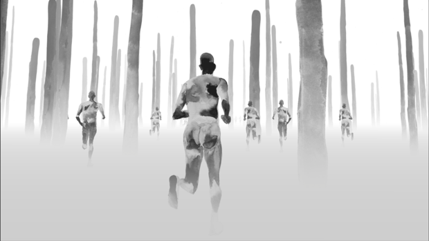 In Shalenny’s Virtual Reality work the viewer goes beyond the horizon on a compressed forty thousand kilometers journey around the world. A game of chance, the journey is the outcome of a line drawn from a bridge and further across the world, taking place in the dead of night, where fuzzy silhouettes of people tear along through desolate landscapes, fleeing into gray blizzards and shadowy forests. Based on watercolors by the artist, one setting replaces the other as the ghostlike figures cross birch forests, oil fields, abandoned churches and oceans in a limitless universe.