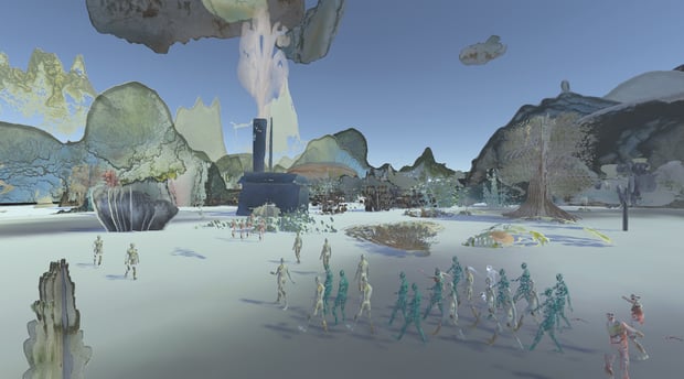 APORIA is a virtual world consisting of a digital live simulation as well as paintings and sculptural objects that transcend the virtual and the real. This way APORIA negotiates the sociological processes of closed and open societies. Above all, „Crowds and Power“, a work of Elias Canetti has become a significant influence on the work. The behavioral dynamics analyzed in the book are transfered to 60 individuals with their very own artificial intelligence (AI). They inhabit the world of APORIA in the form of human avatars. Through complex algorithms, these AI‘s are able to explore their environment and decide on individual actions. A part of them is acting more close-minded and tends to build walls or to act according to a strong order principle. The other part tends to be open and moves more unlimited. All ‚subjects‘ meanwhile follow daily human routines until the moment when a ‚disturbance‘ in the form of a stranger appears - on which the inhabitants of the virtual world can react differently. Groups are formed, and leaders appointed. The dynamics coming into force now are the central topic of this work.